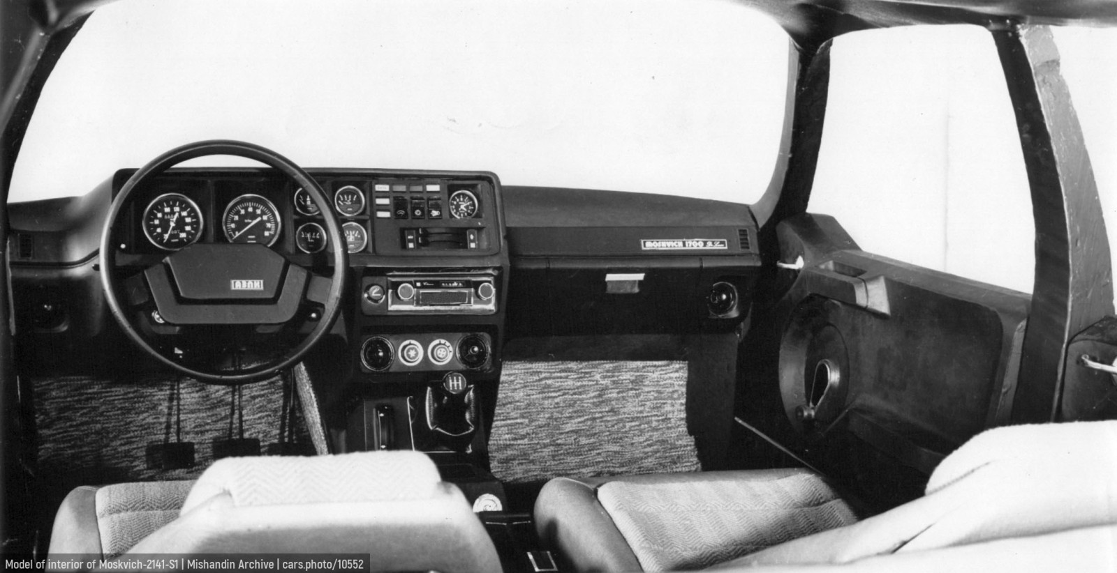 To design the interior of the 2141‑C1, a simplified full‑scale mock‑up was built, replicating the shape of the pillars and doors. Designer Leonid Leonov used imported “truck‑type” instruments to create a dashboard. For layout reasons, the gearshift lever was positioned almost horizontally.