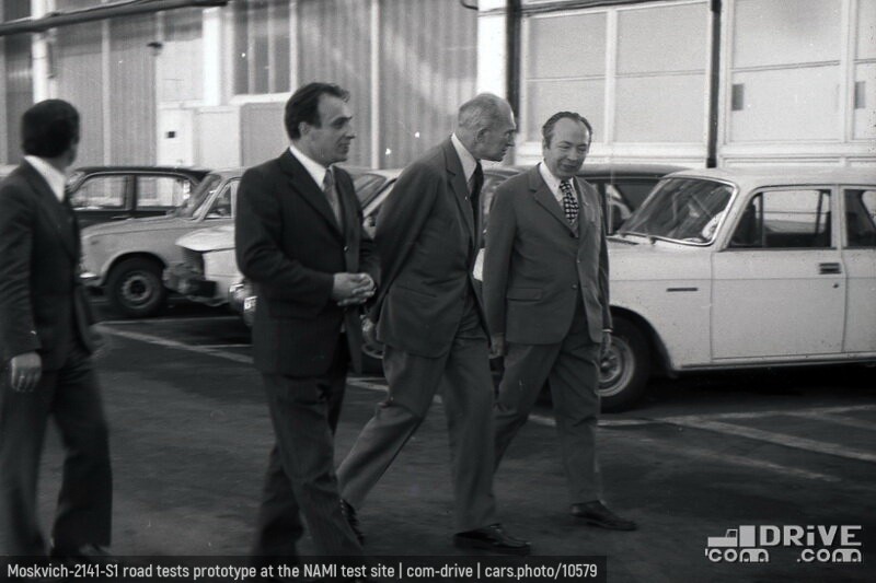 The photo was taken in 1977 during a delegation’s visit to the NAMI test site. In the background, a white Moskvich‑2141‑S1 can be seen – evidently this is the prototype for road tests, since another white prototype had been destroyed in a crash test the year before, in 1976.