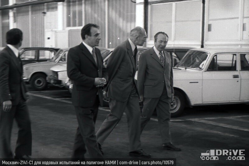 Снимок сделан в 1977 году во время посещения полигона НАМИ делегацией. На заднем плане виден белый М-2141-С1 – очевидно, это экземпляр в упрощённом исполнении, предназначенный для ходовых испытаний, поскольку второй белый образец был разбит на краш-тесте годом ранее, в 1976-м.