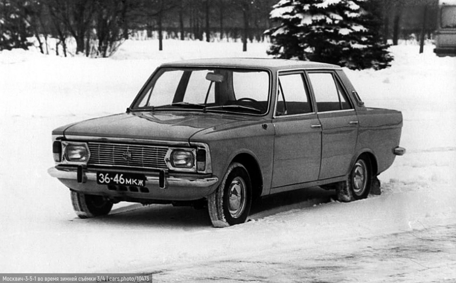 Москвич-3-5-1 во время зимней съёмки, вид спереди 3/4